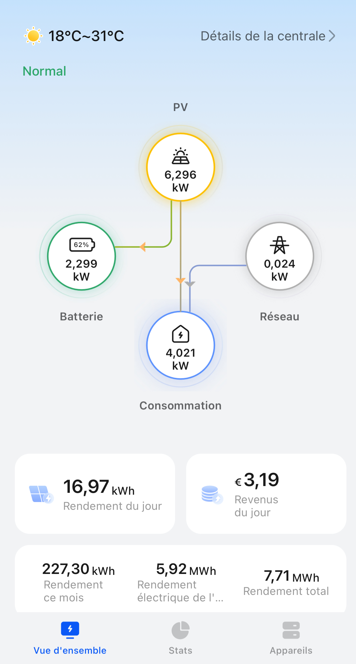 - Production d’énergie : Avec un ensoleillement de 2700 heures par an, l’installation de 3kWc peut produire environ 4000 kWh par an. À un tarif moyen de 0,18 euro par kWh, cela représente une économie annuelle de 720 euros sur la facture d’électricité.